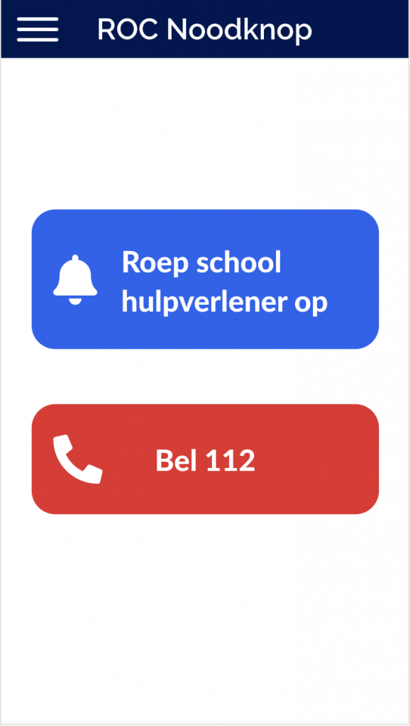 De gebruiker opent de app, hierbij kan hij gelijk op de noodgeval knop drukken, als dit nodig is. Als hij hier op gedrukt heeft komt hij bij het tweede scherm aan. Hier heeft hij de optie om 112 te bellen of om een school hulpverlener op te roepen.
