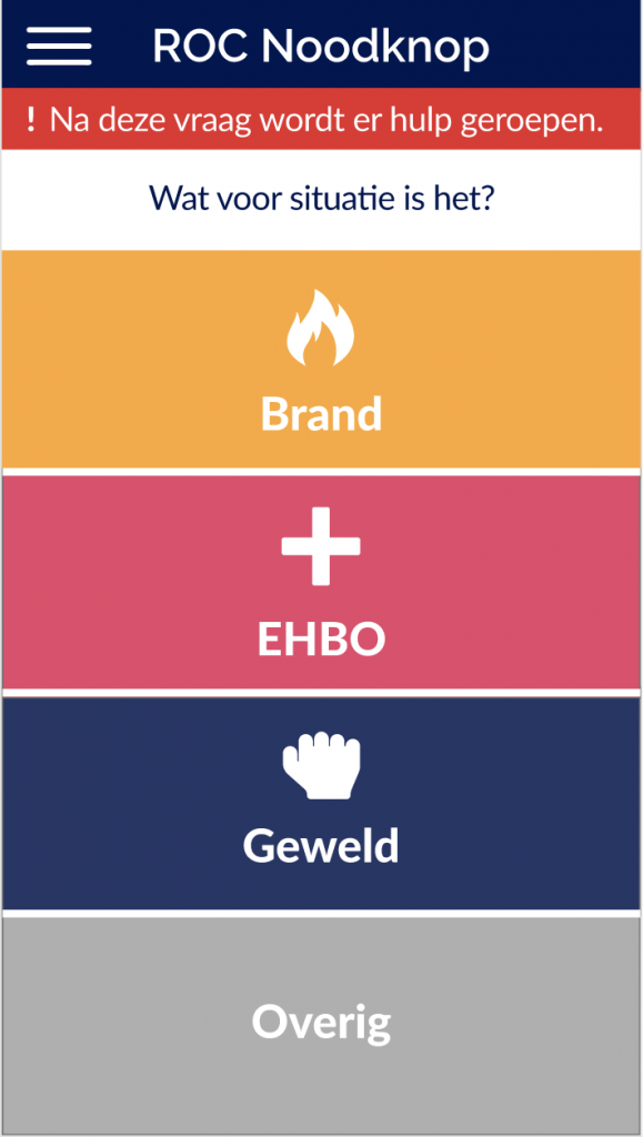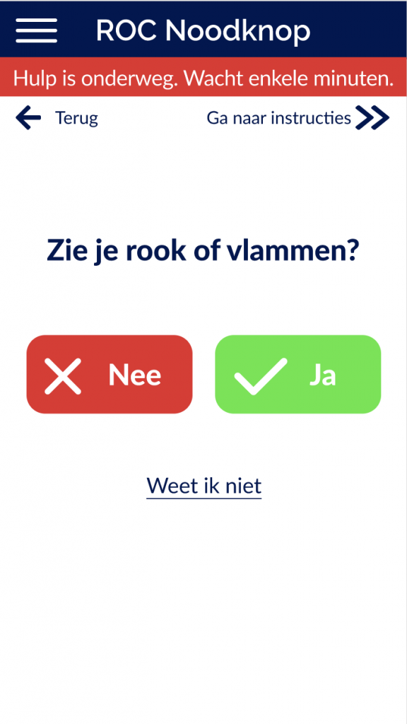 Wanneer de gebruiker op de blauwe knop heeft gedrukt komt hij bij het volgende scherm. Op dit scherm kan de gebruiker aangeven wat voor noodsituatie het is. Wanneer de gebruiker een noodsituatie heeft aangegeven, krijgt de gebruiker meerdere vragen over de noodsituatie die hij met ja, nee of ik weet het niet kan beantwoorden. Het is voor de gebruiker ook mogelijk om de vragen over te slaan en gelijk naar de instructies te gaan. De ingevulde vragen worden doorgegeven aan de BHV’er en/of beveiliger.