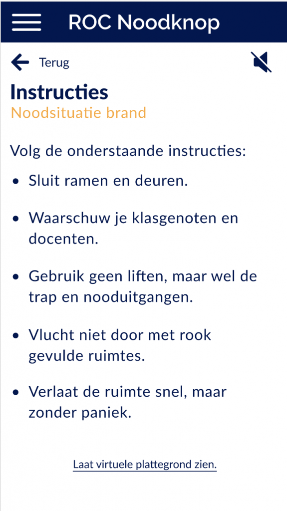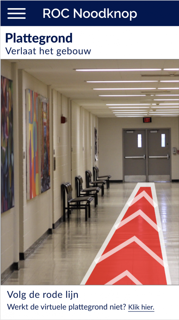 Na de vragen ingevuld te hebben komt de gebruiker bij de instructies. Hier worden instructies getoond aan de hand van de ingevulde vragen. Bij brand wordt door middel van AR een route naar de uitgang getoond.